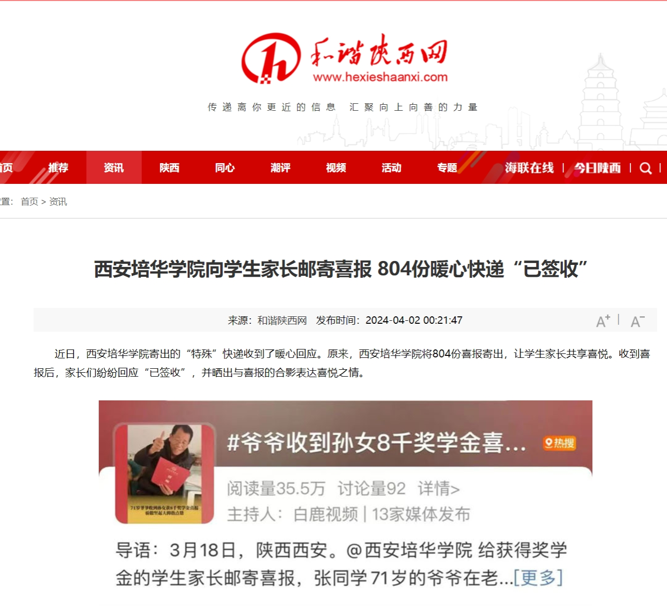 和谐陕西网:西安培华学院向学生家长邮寄喜报 804份暖心快递“已签收”