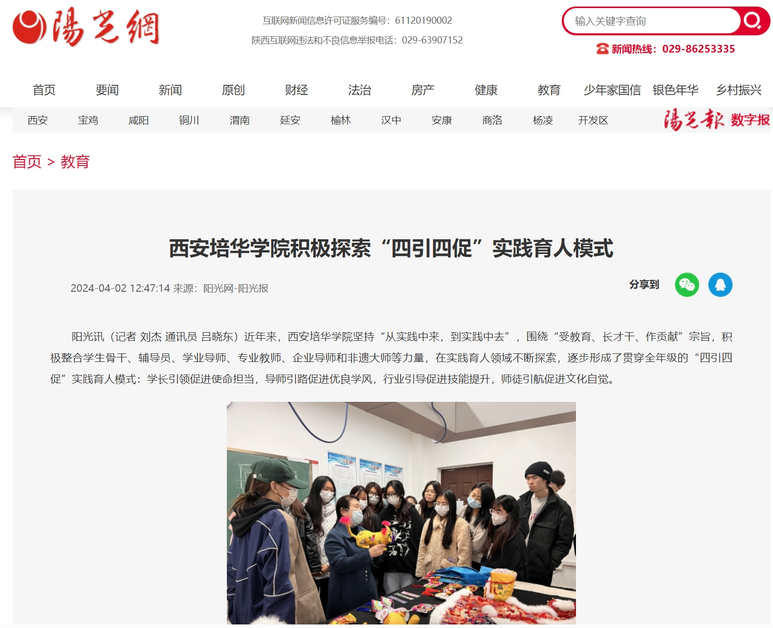 近年来,西安培华学院坚持“从实践中来,到实践中去”,围绕“受教育、长才干、作贡献”宗旨,积极整合学生骨干、辅导员、学业导师、专业教师、企业导师和非遗大师等力量,在实践育人领域不断探索,逐步形成了贯穿全年级的“四引四促”实践育人模式:学长引领促进使命担当,导师引路促进优良学风,行业引导促进技能提升,师徒引航促进文化自觉。