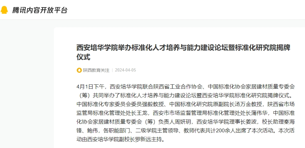 腾讯:西安培华学院举办标准化人才培养与能力建设论坛暨标准化研究院揭牌仪式