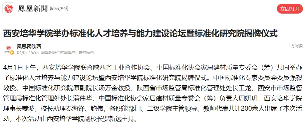 凤凰新闻:西安培华学院举办标准化人才培养与能力建设论坛暨标准化研究院揭牌仪式