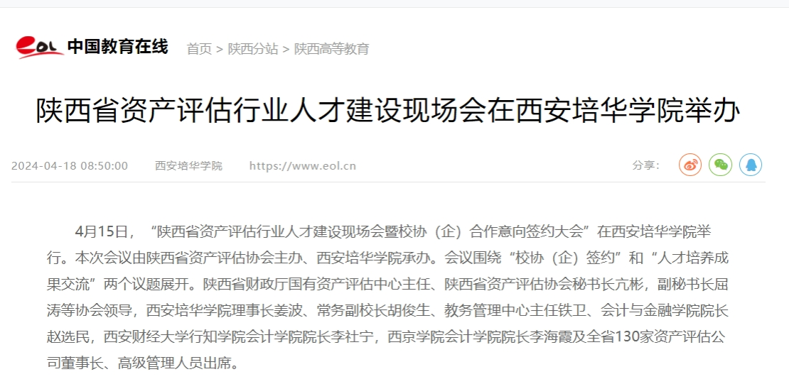 4月15日,“陕西省资产评估行业人才建设现场会暨校协(企)合作意向签约大会”在西安培华学院举行。本次会议由陕西省资产评估协会主办、西安培华学院承办。会议围绕“校协(企)签约”和“人才培养成果交流”两个议题展开。陕西省财政厅国有资产评估中心主任、陕西省资产评估协会秘书长亢彬,副秘书长屈涛等协会领导,西安培华学院理事长姜波、常务副校长胡俊生、教务管理中心主任铁卫、会计与金融学院院长赵选民,西安财经大学行知学院会计学院院长李社宁,西京学院会计学院院长李海霞及全省130家资产评估公司董事长、高级管理人员出席。