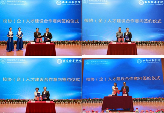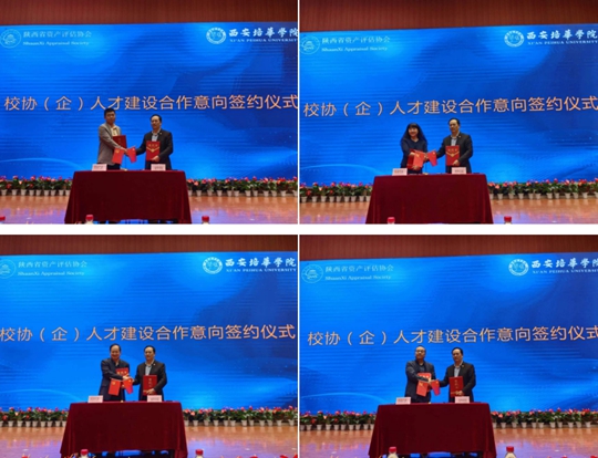 会上,陕西省资产评估协会分别与西安培华学院、西安财经大学行知学院、西京学院签订了人才建设合作意向书;西安培华学院与正衡、新兰特、天健兴业、中和、金达、卓信大华、同道、旭隆、信通、天任十家资产评估公司签订了联培协议。