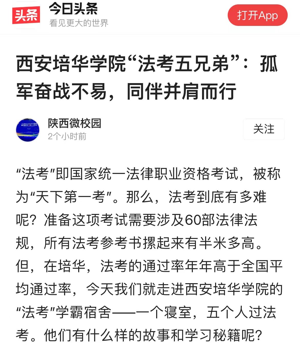 今日头条:西安培华学院“法考五兄弟”:孤军奋战不易,同伴并肩而行