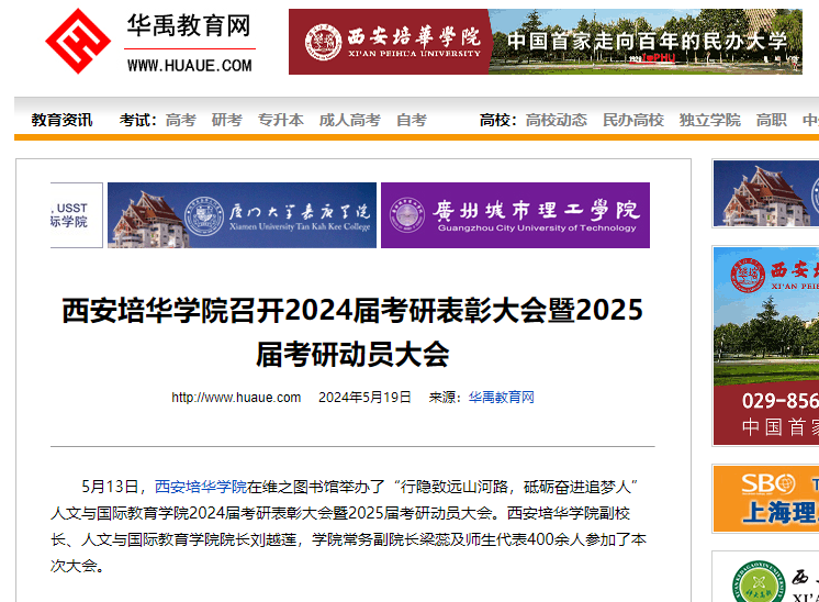 5月13日,西安培华学院在维之图书馆举办了“行隐致远山河路,砥砺奋进追梦人”人文与国际教育学院2024届考研表彰大会暨2025届考研动员大会。西安培华学院副校长、人文与国际教育学院院长刘越莲,学院常务副院长梁蕊及师生代表400余人参加了本次大会。