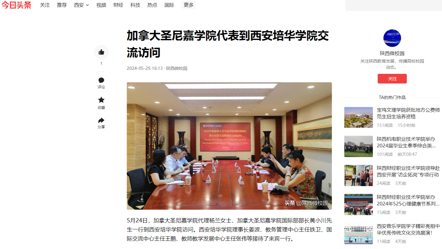 今日头条:加拿大圣尼嘉学院代表到西安培华学院交流访问