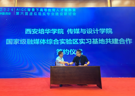 5月18日,2024年AIGC技术背景下高等教育人才培养暨第六届虚拟现实专业建设研讨会在西安举办。学校传媒与设计学院党委书记、副院长王飞受邀参加并代表学校与陕西丝路云启智能科技有限公司签署了国家级融媒体综合实验区校企合作协议。