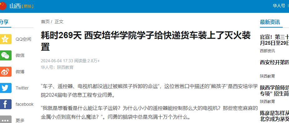 华人号:耗时269天 西安培华学院学子给快递货车装上了灭火装置