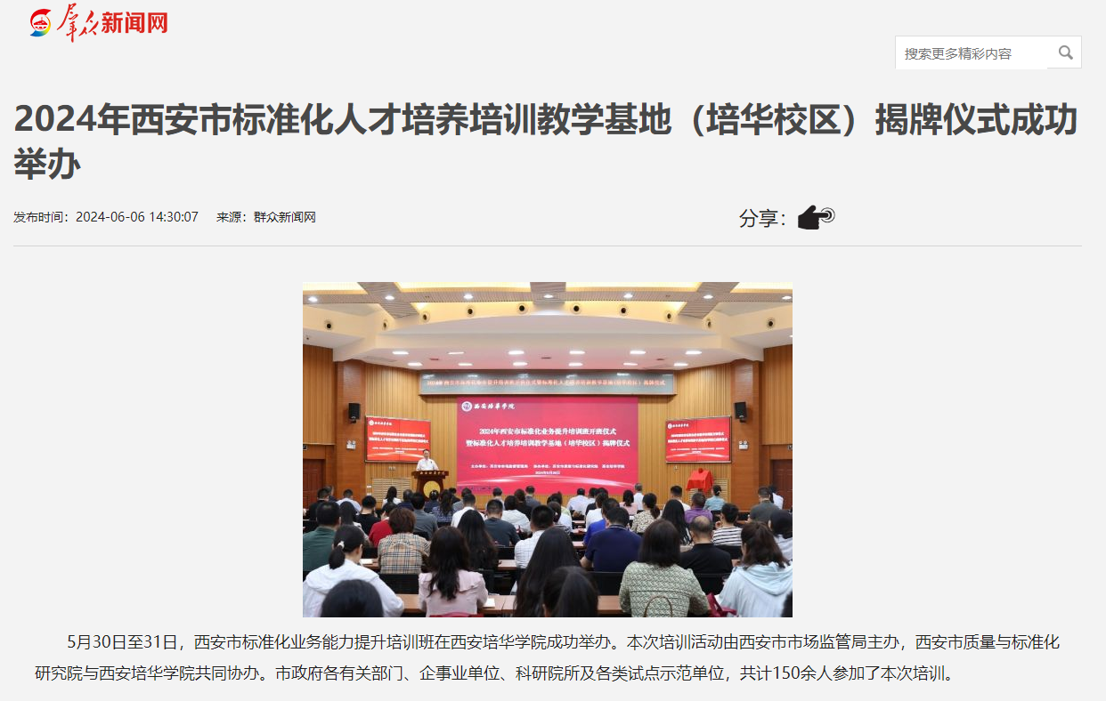 群众新闻网:2024年西安市标准化人才培养培训教学基地(培华校区)揭牌仪式成功举办