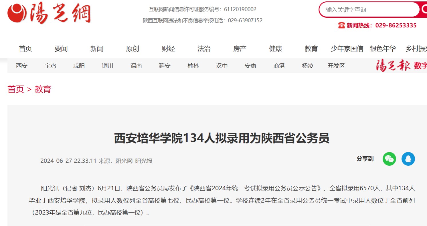 阳光讯(记者 刘杰)6月21日,陕西省公务员局发布了《陕西省2024年统一考试拟录用公务员公示公告》,全省拟录用6570人,其中134人毕业于西安培华学院,拟录用人数位列全省高校第七位、民办高校第一位。学校连续2年在全省录用公务员统一考试中录用人数位于全省前列(2023年是全省第九位,民办高校第一位)。