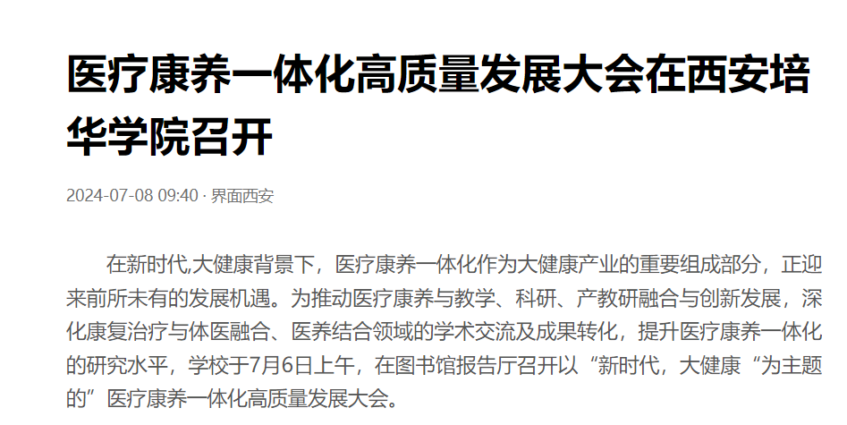 在新时代,大健康背景下,医疗康养一体化作为大健康产业的重要组成部分,正迎来前所未有的发展机遇。为推动医疗康养与教学、科研、产教研融合与创新发展,深化康复治疗与体医融合、医养结合领域的学术交流及成果转化,提升医疗康养一体化的研究水平,学校于7月6日上午,在图书馆报告厅召开以“新时代,大健康“为主题的”医疗康养一体化高质量发展大会。