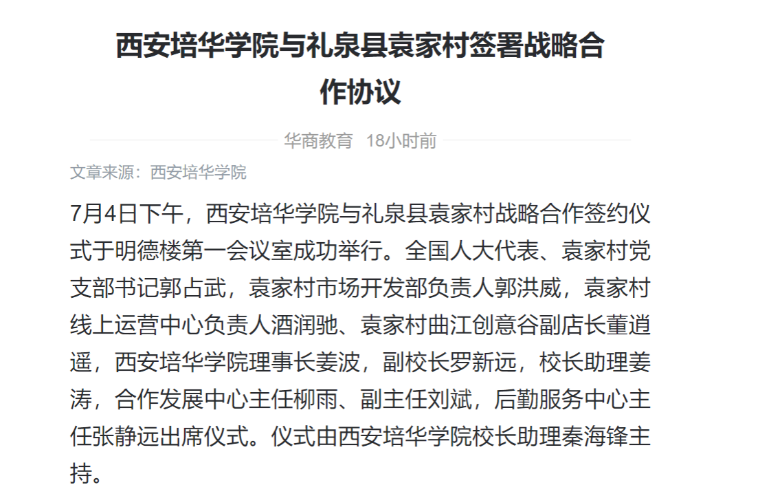 7月4日下午,西安培华学院与礼泉县袁家村战略合作签约仪式于明德楼第一会议室成功举行。全国人大代表、袁家村党支部书记郭占武,袁家村市场开发部负责人郭洪威,袁家村线上运营中心负责人酒润驰、袁家村曲江创意谷副店长董逍遥,西安培华学院理事长姜波,副校长罗新远,校长助理姜涛,合作发展中心主任柳雨、副主任刘斌,后勤服务中心主任张静远出席仪式。仪式由西安培华学院校长助理秦海锋主持。