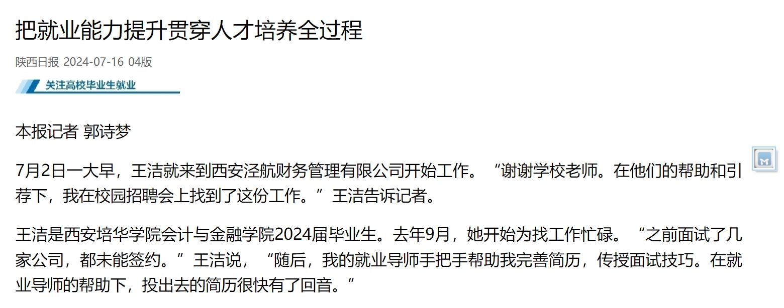 王洁是西安培华学院会计与金融学院2024届毕业生。去年9月,她开始为找工作忙碌。“之前面试了几家公司,都未能签约。”王洁说,“随后,我的就业导师手把手帮助我完善简历,传授面试技巧。在就业导师的帮助下,投出去的简历很快有了回音。”