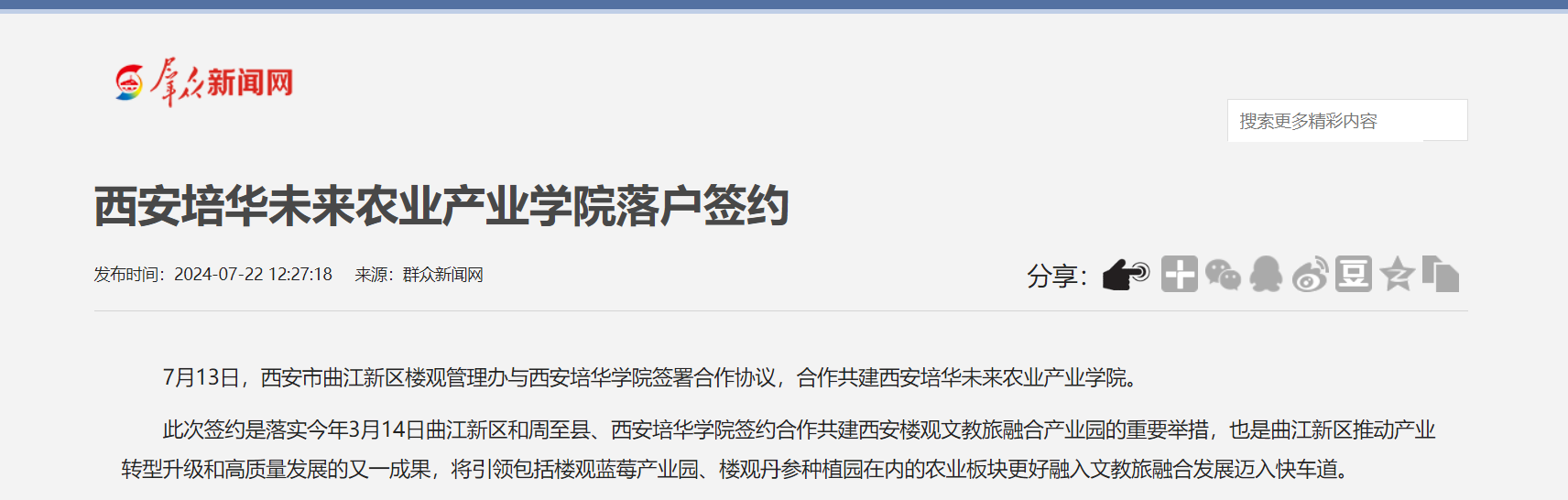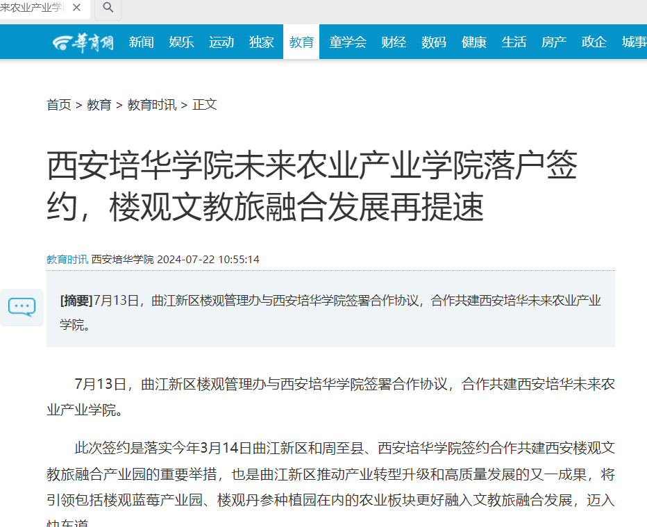 7月13日,曲江新区楼观管理办与西安培华学院签署合作协议,合作共建西安培华未来农业产业学院。