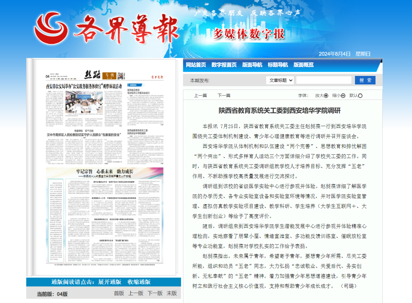 本报讯 7月25日,陕西省教育系统关工委主任赵昶葆一行到西安培华学院围绕关工委体制机制建设、青少年心理健康教育等进行调研并召开座谈会。