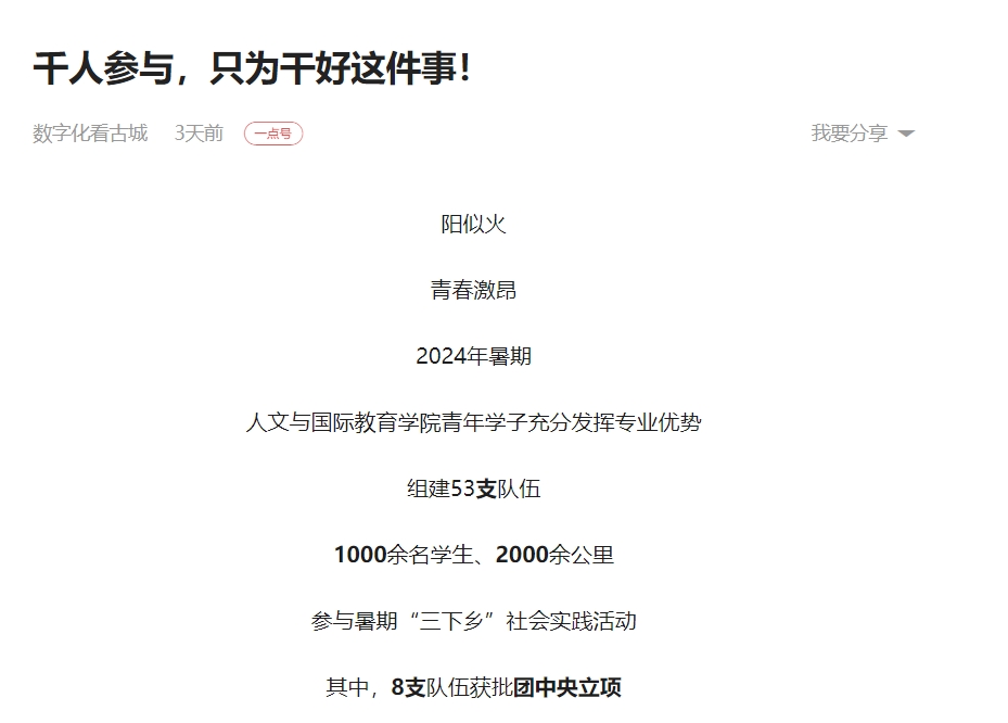 此次实践活动,开展了为期七天的思政、体育、艺术、文明等专项模块课程。还专门成立了团队视频号,对活动进行宣传和记录,累计播放量突破5000次,点赞量突破600次。相关成果被当地政府表扬多次,当地媒体报道10次,同时还被其他官方媒体报道20余次。