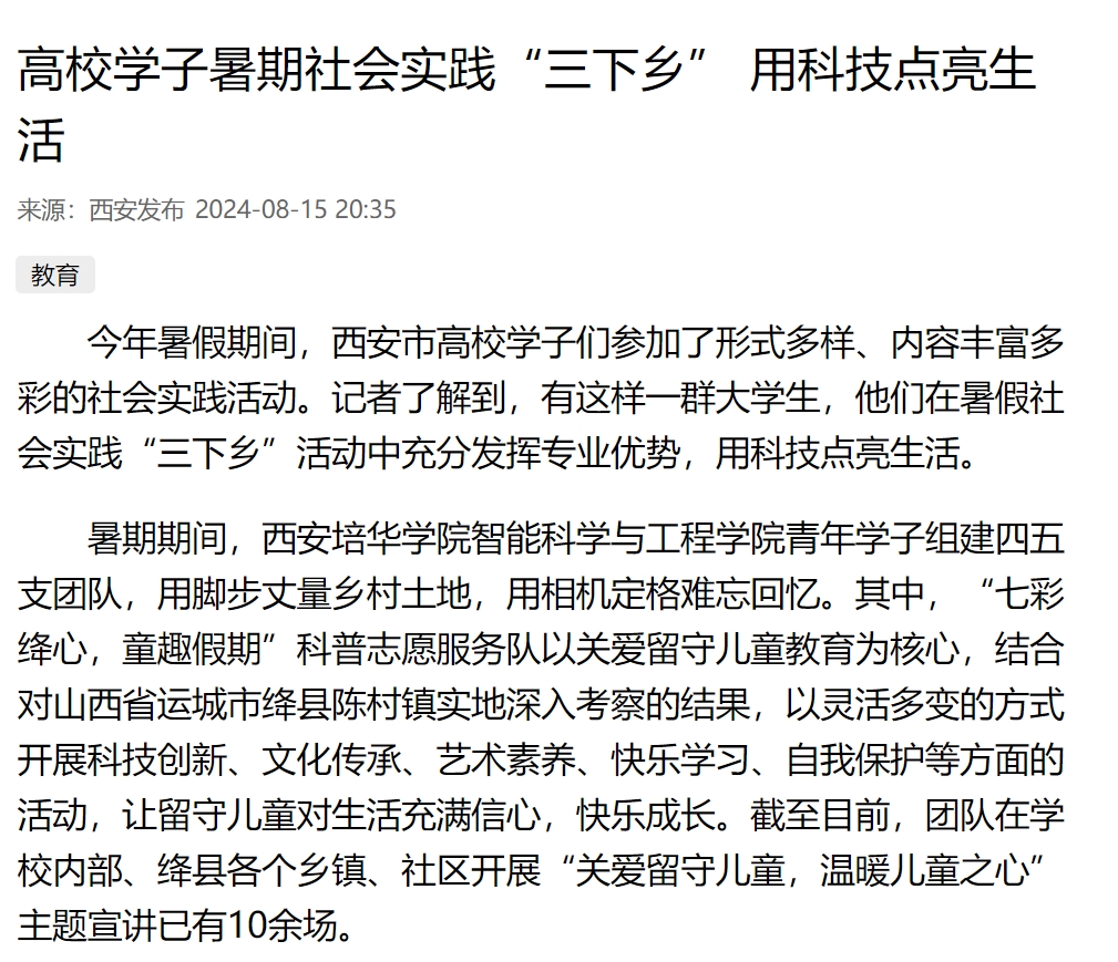 暑期期间,西安培华学院智能科学与工程学院青年学子组建四五支团队,用脚步丈量乡村土地,用相机定格难忘回忆。其中,“七彩绛心,童趣假期”科普志愿服务队以关爱留守儿童教育为核心,结合对山西省运城市绛县陈村镇实地深入考察的结果,以灵活多变的方式开展科技创新、文化传承、艺术素养、快乐学习、自我保护等方面的活动,让留守儿童对生活充满信心,快乐成长。截至目前,团队在学校内部、绛县各个乡镇、社区开展“关爱留守儿童,温暖儿童之心”主题宣讲已有10余场。