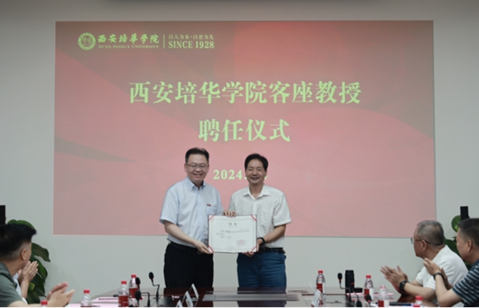 在客座教授聘任仪式环节,省决咨委民生组副组长、西安理工大学原党委书记刘德安教授,省决咨委委员、陕西省发改委原副主任王振海受聘为西安培华学院客座教授,姜波理事长向其颁发了客座教授聘书,并亲自佩戴校徽。