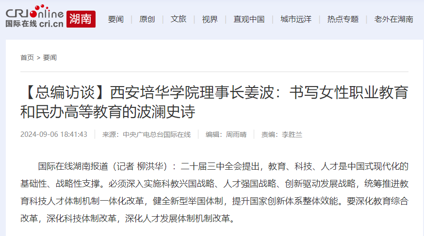 已有96年历史的西安培华学院,作为中国西部首家获得学士学位授予权的民办普通本科高校,正加快推进应用型高水平民办大学建设,奋力开启建成特色鲜明的高水平应用型大学新征程。近日,西安培华学院理事长姜波做客《总编访谈室》栏目,与陕西省政协委员、国际在线陕西频道总编辑史佳畅谈,分享“中国首家走向百年的民办大学”背后的故事。