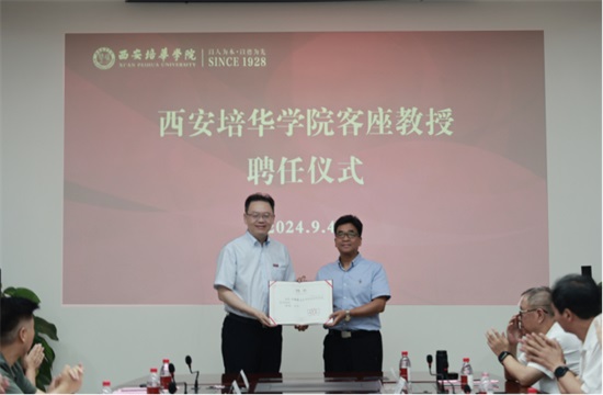 在客座教授聘任仪式环节,省决咨委民生组副组长、西安理工大学原党委书记刘德安,省决咨委委员、陕西省发改委原副主任王振海受聘为西安培华学院客座教授,姜波向其颁发了客座教授聘书,并亲自佩戴校徽。