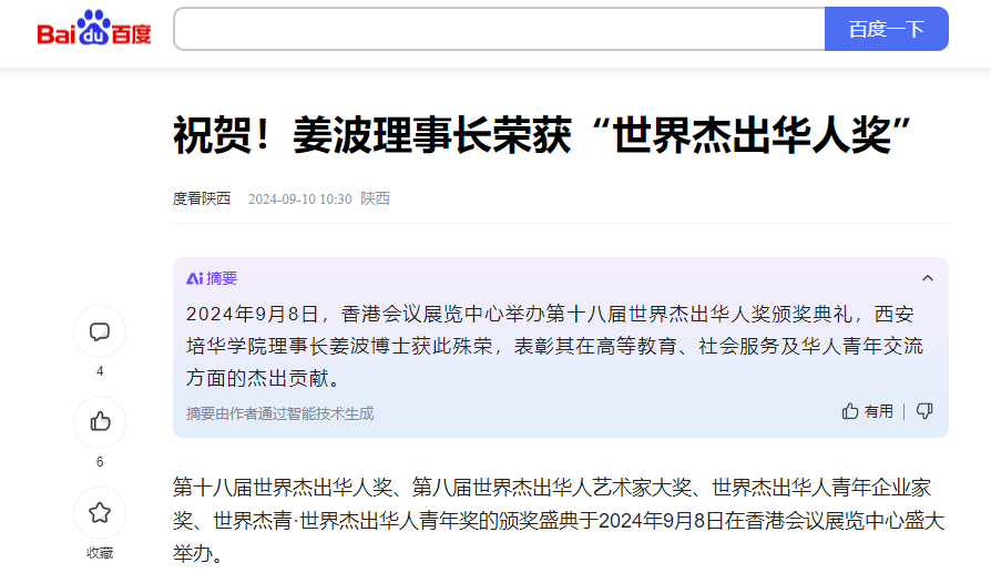 在本届颁奖典礼上,西安培华学院理事长姜波博士获颁“世界杰出华人奖”。
