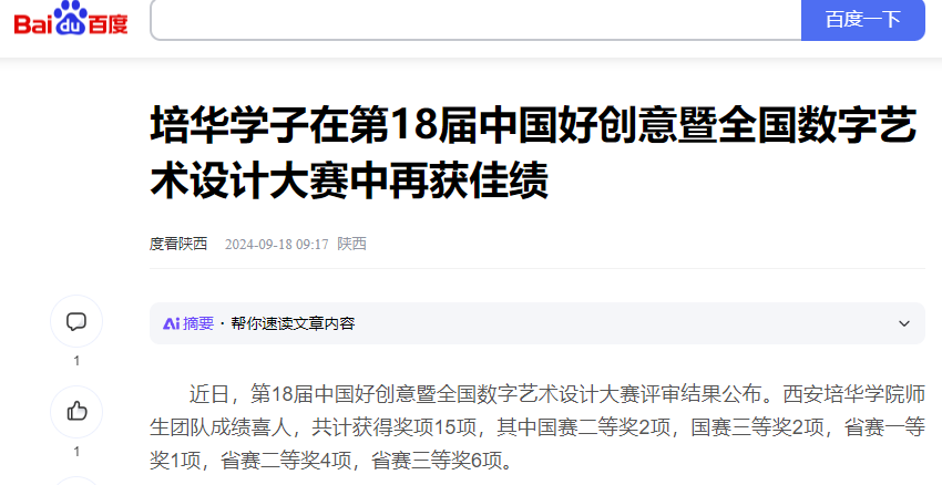 近日,第18届中国好创意暨全国数字艺术设计大赛评审结果公布。西安培华学院师生团队成绩喜人,共计获得奖项15项,其中国赛二等奖2项,国赛三等奖2项,省赛一等奖1项,省赛二等奖4项,省赛三等奖6项。