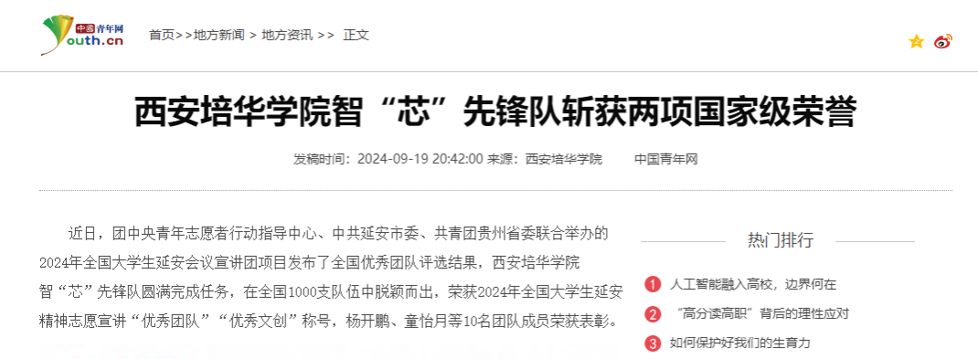 近日,团中央青年志愿者行动指导中心、中共延安市委、共青团贵州省委联合举办的2024年全国大学生延安会议宣讲团项目发布了全国优秀团队评选结果,西安培华学院智“芯”先锋队圆满完成任务,在全国1000支队伍中脱颖而出,荣获2024年全国大学生延安精神志愿宣讲“优秀团队”“优秀文创”称号,杨开鹏、童怡月等10名团队成员荣获表彰。