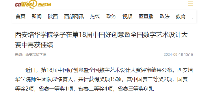 近日,第18届中国好创意暨全国数字艺术设计大赛评审结果公布。西安培华学院师生团队成绩喜人,共计获得奖项15项,其中国赛二等奖2项,国赛三等奖2项,省赛一等奖1项,省赛二等奖4项,省赛三等奖6项。