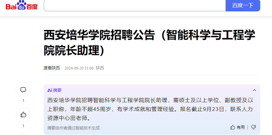 百度:西安培华学院招聘公告(智能科学与工程学院院长助理)