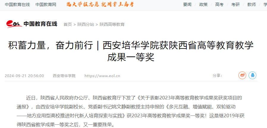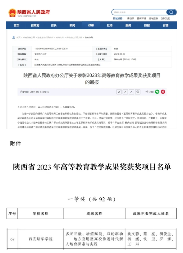 近日,陕西省人民政府办公厅、陕西省教育厅下发了《关于表彰2023年高等教育教学成果奖获奖项目的通报》,由西安培华学院副校长、党委副书记姚文静副教授主持申报的《多元互融、增值赋能、双轮驱动——地方应用型高校推进时代新人培育探索与实践》获2023年高等教育教学成果奖一等奖!这是继2019年获得陕西省教学成果一等奖之后,又一重要殊荣。