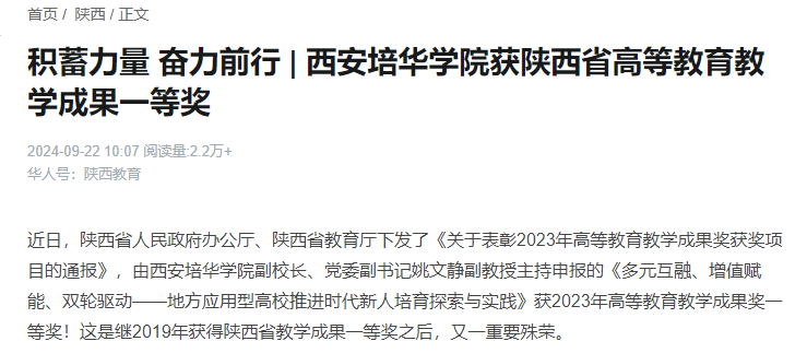 近日,陕西省人民政府办公厅、陕西省教育厅下发了《关于表彰2023年高等教育教学成果奖获奖项目的通报》,由西安培华学院副校长、党委副书记姚文静副教授主持申报的《多元互融、增值赋能、双轮驱动——地方应用型高校推进时代新人培育探索与实践》获2023年高等教育教学成果奖一等奖!这是继2019年获得陕西省教学成果一等奖之后,又一重要殊荣。