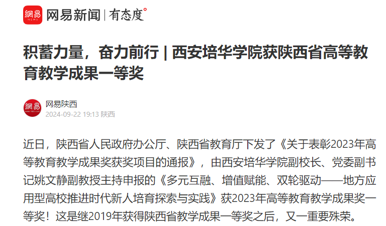 近日,陕西省人民政府办公厅、陕西省教育厅下发了《关于表彰2023年高等教育教学成果奖获奖项目的通报》,由西安培华学院副校长、党委副书记姚文静副教授主持申报的《多元互融、增值赋能、双轮驱动——地方应用型高校推进时代新人培育探索与实践》获2023年高等教育教学成果奖一等奖!这是继2019年获得陕西省教学成果一等奖之后,又一重要殊荣。