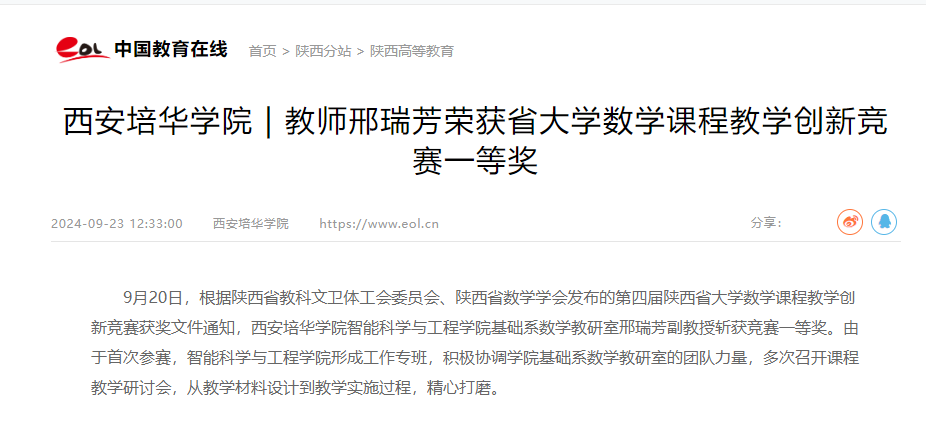 9月20日,根据陕西省教科文卫体工会委员会、陕西省数学学会发布的第四届陕西省大学数学课程教学创新竞赛获奖文件通知,西安培华学院智能科学与工程学院基础系数学教研室邢瑞芳副教授斩获竞赛一等奖。由于首次参赛,智能科学与工程学院形成工作专班,积极协调学院基础系数学教研室的团队力量,多次召开课程教学研讨会,从教学材料设计到教学实施过程,精心打磨。