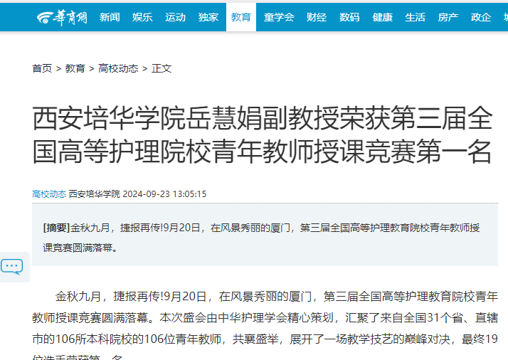 金秋九月,捷报再传!9月20日,在风景秀丽的厦门,第三届全国高等护理教育院校青年教师授课竞赛圆满落幕。本次盛会由中华护理学会精心策划,汇聚了来自全国31个省、直辖市的106所本科院校的106位青年教师,共襄盛举,展开了一场教学技艺的巅峰对决,最终19位选手荣获第一名。