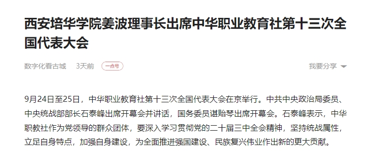 近年来,姜波理事长积极参与中华职教社活动,建言献策、身体力行。连续三届出任陕西省中华职教社副主任、担任中华职教社第十二届理事。西安培华学院先后获得两次“黄炎培优秀学校奖”,一次“黄炎培优秀校长奖”和“黄炎培优秀教师奖”;荣获中华职业教育创新创业大赛一等奖,实现了陕西零的突破,西安培华学院无疑成为中华职教社在全国发展的一个典型代表。