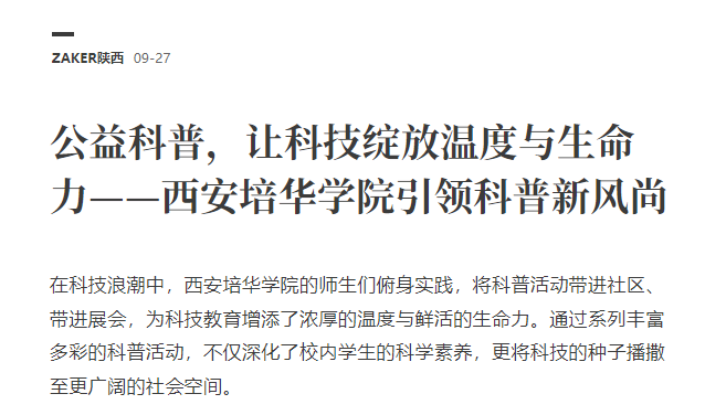 为了践行 " 弘扬科学家精神,激发全社会创新活力 " 的使命,西安培华学院积极参与并组织了一系列群众性科普活动。