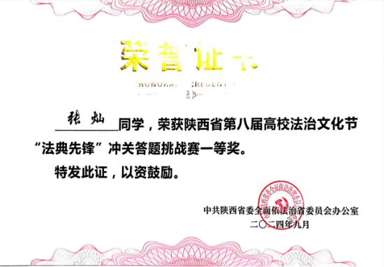 近年来,法学院教师指导学生在“学宪法 讲宪法”演讲、素养竞赛、陕西省高校法治文化节、“互联网+”创新创业大赛等省部级比赛中取得佳绩,获得第七届陕西省“学宪法 讲宪法”知识竞赛三等奖、第八届陕西省“学宪法 讲宪法”素养竞赛二等奖,新媒体普法剧《黎明将至》获得第七届陕西省高校法治文化节“十佳创新普法活动”,第七届、第八届、第九届国际“互联网+”大学生创新创业大赛陕西省赛区铜奖,陕西省第六届中华职业教育创新创业大赛二等奖等。
