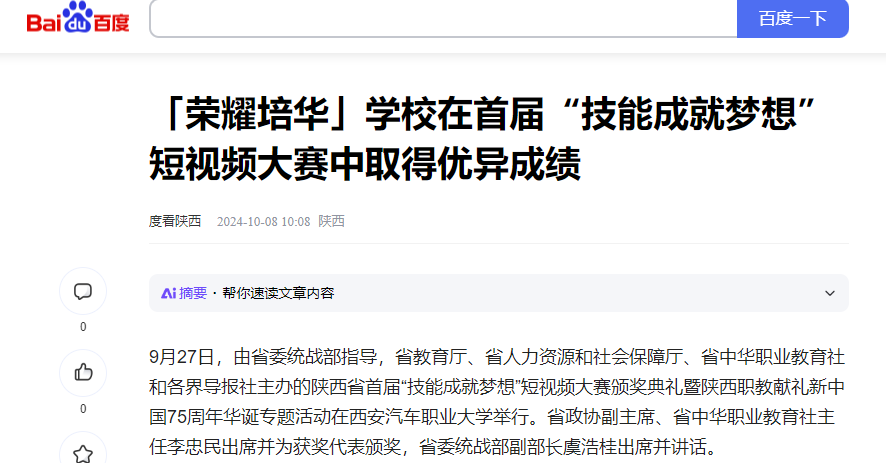 9月27日,由省委统战部指导,省教育厅、省人力资源和社会保障厅、省中华职业教育社和各界导报社主办的陕西省首届“技能成就梦想”短视频大赛颁奖典礼暨陕西职教献礼新中国75周年华诞专题活动在西安汽车职业大学举行。省政协副主席、省中华职业教育社主任李忠民出席并为获奖代表颁奖,省委统战部副部长虞浩桂出席并讲话。
