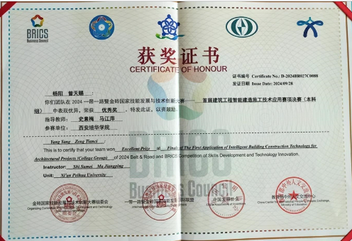智能科学与工程学院在本次金砖大赛建筑赛项中贯彻落实关于“激励更多劳动者特别是青年一代走技能成才、技能报国之路”的重要指示,和金砖国家领导人关于加强金砖国家间技能、加强标准化领域交流与合作等有关精神,不仅高度聚焦党的二十大“推进工业、建筑、交通等领域清洁低碳转型”精神,对接国家“十四五”规划“发展智能建造、推广绿色建材、建设低碳城市”要求,而且积极响应绿色低碳创新型竞赛设计思路、数字化竞赛平台,大力推动土木工程专业学生进行施工类行业相关岗位的知识、技能、素养训练。最终我校土木工程专业学生王博洋、刘小川(指导老师刘清颖、史素梅)获得区域团体三等奖一项,土木工程专业学生杨阳、曾天赐(指导老师史素梅、马江萍)获得区域团体三等奖一项,土木工程专业学生杨阳、曾天赐(指导老师史素梅、马江萍)获得全国团体优秀奖1项。