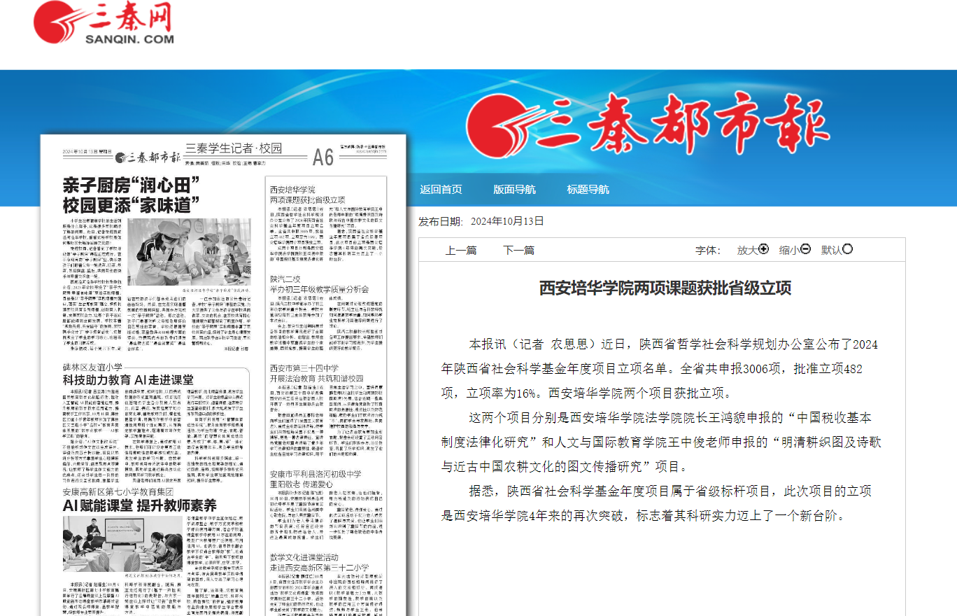这两个项目分别是西安培华学院法学院院长王鸿貌申报的“中国税收基本制度法律化研究”和人文与国际教育学院王中俊老师申报的“明清耕织图及诗歌与近古中国农耕文化的图文传播研究”项目。