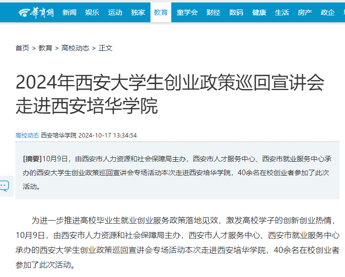 为进一步推进高校毕业生就业创业服务政策落地见效,激发高校学子的创新创业热情,10月9日,由西安市人力资源和社会保障局主办,西安市人才服务中心、西安市就业服务中心承办的西安大学生创业政策巡回宣讲会专场活动本次走进西安培华学院,40余名在校创业者参加了此次活动。