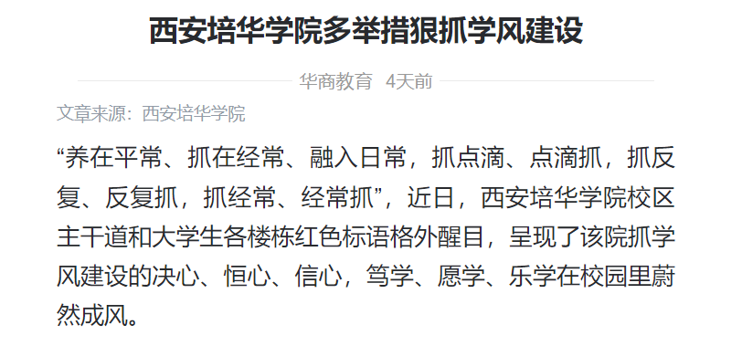 “养在平常、抓在经常、融入日常,抓点滴、点滴抓,抓反复、反复抓,抓经常、经常抓。”近日,西安培华学院校区主干道和大学生各楼栋红色标语格外醒目,呈现了该院抓学风建设的决心、恒心、信心,笃学、愿学、乐学在校园里蔚然成风。