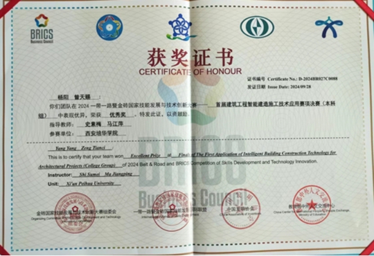 西安培华学院智能科学与工程学院在本次金砖大赛建筑赛项中高度聚焦党的二十大“推进工业、建筑、交通等领域清洁低碳转型”精神,对接国家“十四五”规划“发展智能建造、推广绿色建材、建设低碳城市”要求,而且积极响应绿色低碳创新型竞赛设计思路、数字化竞赛平台,大力推动土木工程专业学生进行施工类行业相关岗位的知识、技能、素养训练。最终西安培华学院土木工程专业学生王博洋、刘小川(指导老师刘清颖、史素梅)获得区域团体三等奖一项,土木工程专业学生杨阳、曾天赐(指导老师史素梅、马江萍)获得区域团体三等奖一项,土木工程专业学生杨阳、曾天赐(指导老师史素梅、马江萍)获得全国团体优秀奖1项。