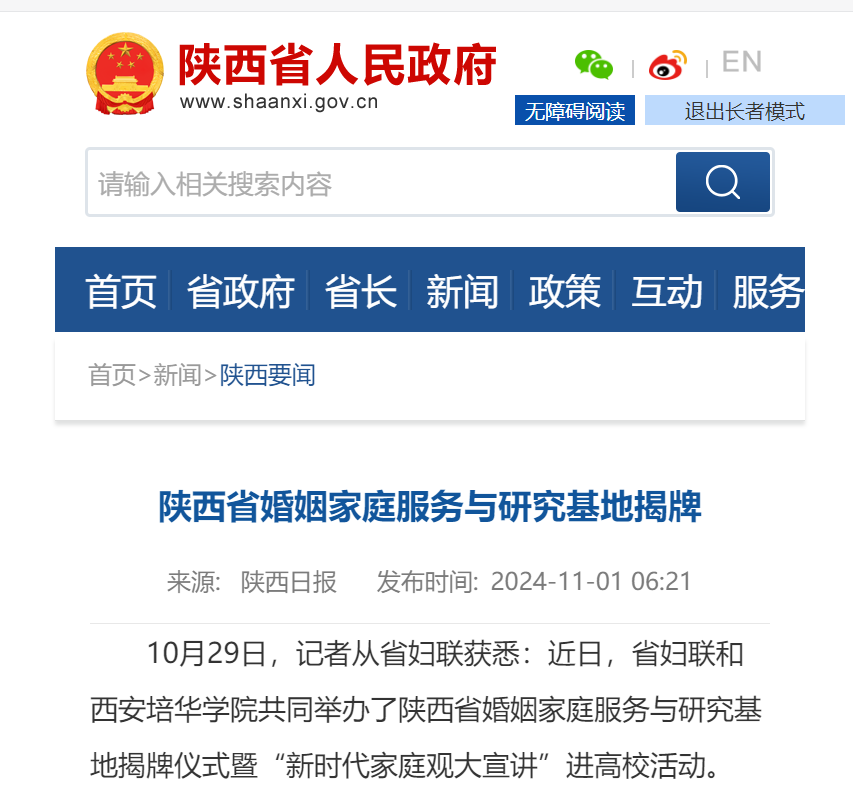 10月29日,记者从省妇联获悉:近日,省妇联和西安培华学院共同举办了陕西省婚姻家庭服务与研究基地揭牌仪式暨“新时代家庭观大宣讲”进高校活动。
