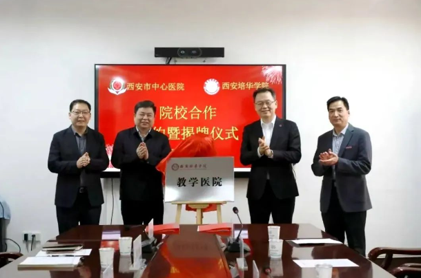 为进一步加强医校深度融合,持续推动医校协同发展,实现医校双方“优势互补、资源共享、互惠双赢、共同发展”。11月1日下午,西安市中心医院与西安培华学院举办了“医校合作”签约暨揭牌仪式。西安培华学院理事长姜波、校长助理秦海锋、鲍伟、西安培华学院医学院院长扈国栋、副院长别蓓蓓、西安培华医院院长李旭军,市中心医院院长胡明军、党委书记王栋、总会计师李阳、副院长成小勇、纪委书记周建群、副院长郭宏珺、张静涛及部分行政职能科室负责人约20人参会。会议由副院长郭宏珺主持。