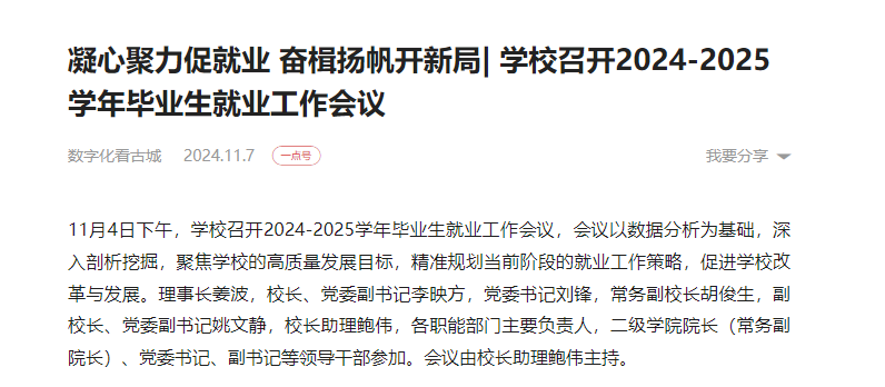副校长姚文静对2025届毕业生就业工作进行了详细全面部署,她强调2025年要全面落实党中央、国务院和省委、省政府关于高校毕业生就业创业工作的决策部署,认真学习《中共中央国务院关于实施就业优先战略促进高质量充分就业的意见》文件精神,结合学校“十四五”发展规划及审核评估整改要求,实施就业优先战略,强化就业优先政策,破解结构性就业矛盾,深化就业工作机制改革,以构建高质量就业指导服务育人体系为导向,夯实就业工作“一把手”工程,完善目标导向考评机制和全程化就业指导服务体系,加强就业渠道拓展,深化访企拓岗专项行动,深化校企“实习+就业”模式建设。要立足高质量就业工作要求,强化就业与专业设置联动,强化就业与人才培养联动。推动就业教育与思政教育、专业教育深度融合,积极开展精准化指导和基层就业引导,激发学院主体作用,确保毕业生高质量充分就业。