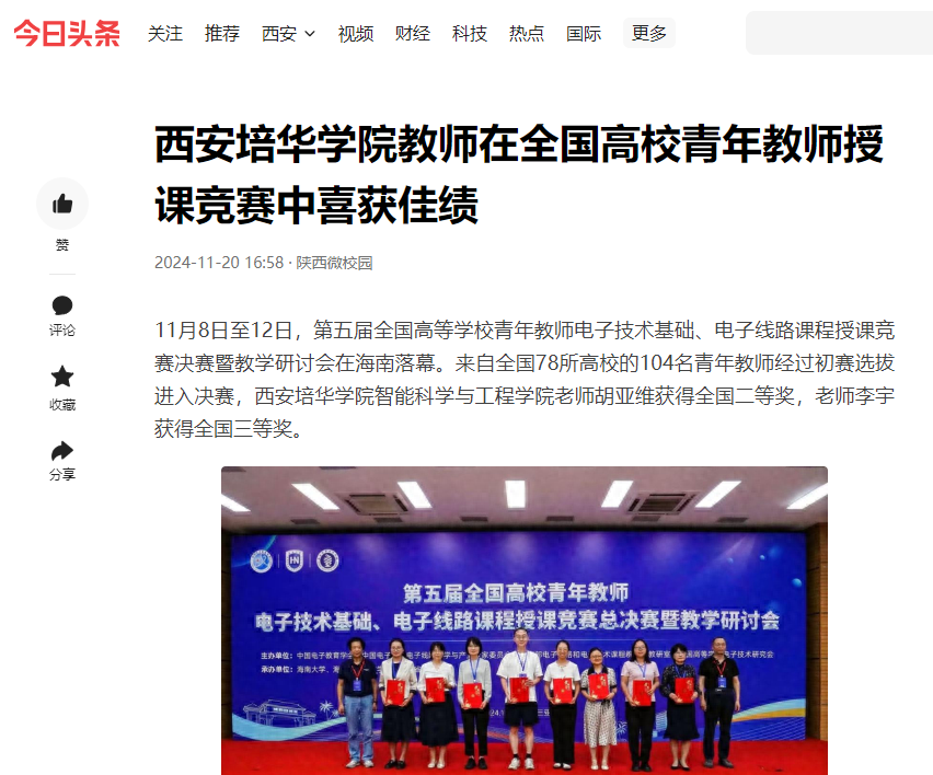 11月8日至12日,第五届全国高等学校青年教师电子技术基础、电子线路课程授课竞赛决赛暨教学研讨会在海南落幕。来自全国78所高校的104名青年教师经过初赛选拔进入决赛,西安培华学院智能科学与工程学院老师胡亚维获得全国二等奖,老师李宇获得全国三等奖。