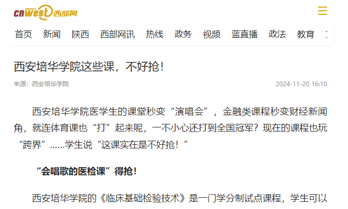 在西安培华学院,医学生的课堂秒变“演唱会”,金融类课程秒变财经新闻角,就连体育课咋也“打”起来呢,一不小心还打到全国冠军?现在的课程也玩“跨界”……学生说:“这课实在是不好抢!”