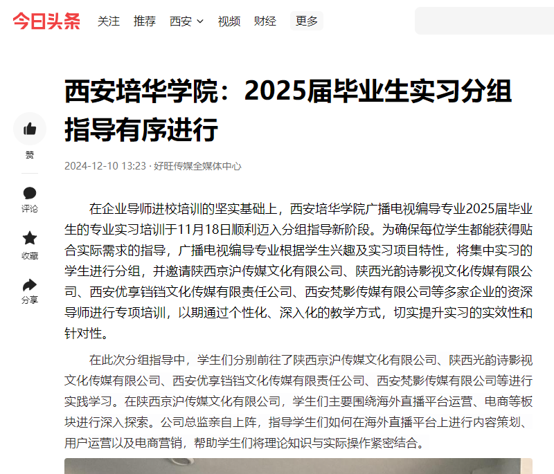 在此次分组指导中,学生们分别前往了陕西京沪传媒文化有限公司、陕西光韵诗影视文化传媒有限公司、西安优享铛铛文化传媒有限责任公司、西安梵影传媒有限公司等进行实践学习。在陕西京沪传媒文化有限公司,学生们主要围绕海外直播平台运营、电商等板块进行深入探索。公司总监亲自上阵,指导学生们如何在海外直播平台上进行内容策划、用户运营以及电商营销,帮助学生们将理论知识与实际操作紧密结合。
