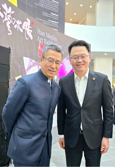 姜波理事长与世界华人协会常务副主席、世界华商投资基金会创会会长马兴利博士、韩美林先生在一起
