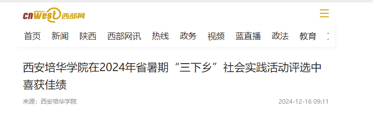 近日,中共陕西省委宣传部、中共陕西省委教育工委、共青团陕西省委、陕西省学生联合会联合印发文件,通报了2024年陕西省大学生暑假文化科技卫生“三下乡”社会实践活动结果,西安培华学院凭借卓越的组织能力荣获多项省级荣誉。